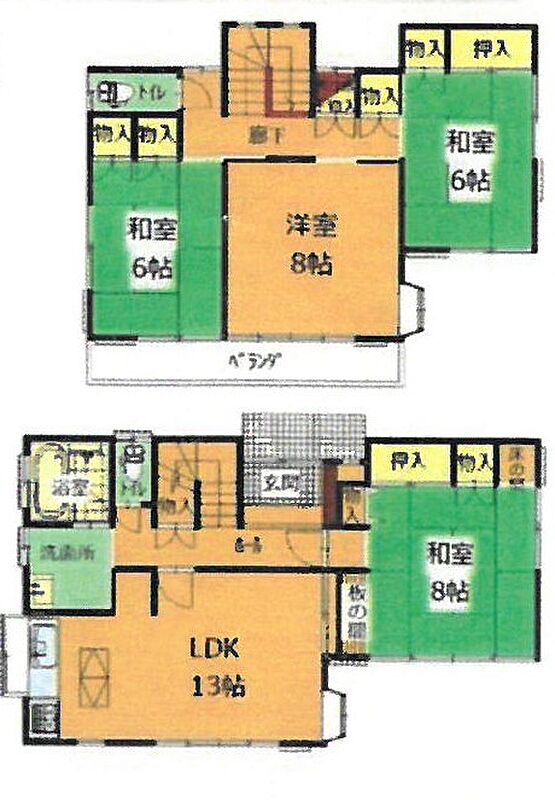 | 間取詳細 | リビングダイニングキッチン 13帖(1階) 和室 8畳(1階) 和室 6畳(2階)×2 洋室 8帖(2階) | ||