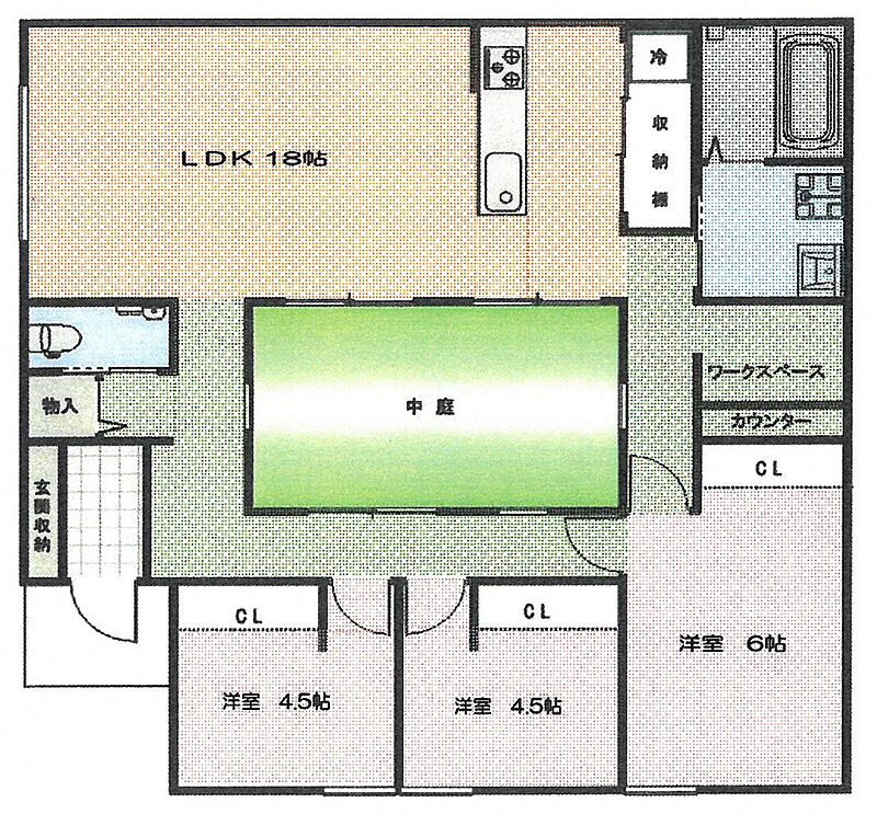 | 間取詳細 | リビングダイニングキッチン 18帖(1階) 洋室 6帖(1階) 洋室 4.5帖(1階)×2 | ||